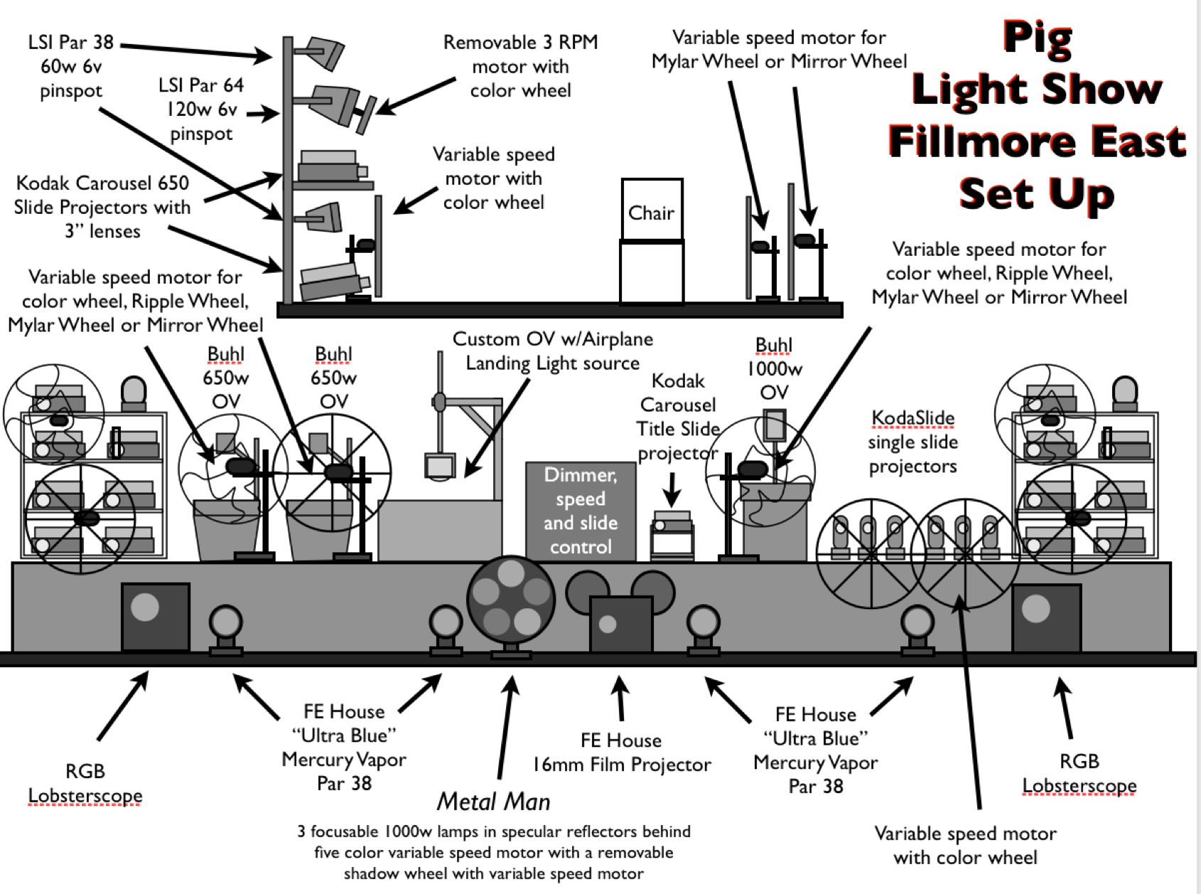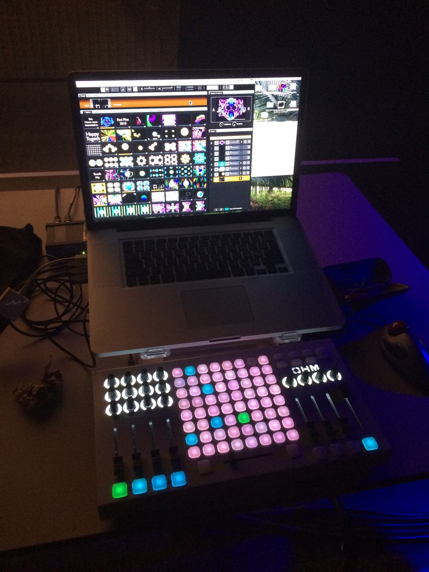 Doing a light show used to mean carrying around TONS of equipment, slide and overhead projectors, screens, color wheels, clock faces, liquids, slides) and took hours to set up and many people to operate.